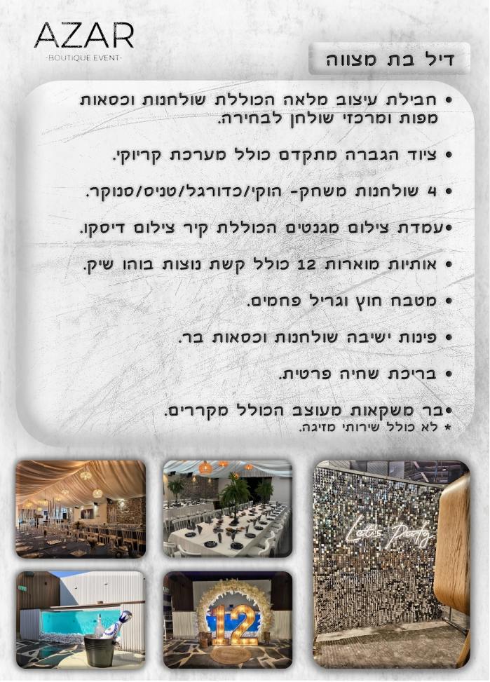 הרכבנו עבורכם את החבילה המושלמת לבת מצווה עד 70 מוזמנים, חבילה הכוללת מגוון אטרקציות לכל חלקי האירוע מערכת תאורה והגברה מתקדמת, חבילת עיצוב מלאה ועוד